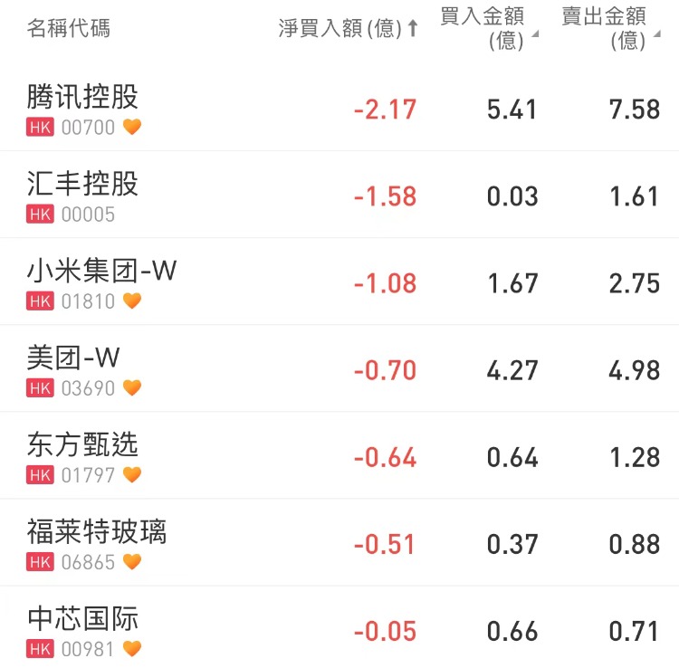 南下资金今日净卖出腾讯2.17亿港元,汇丰控股1.58亿港元,小米1.07亿港元;净买入中国移动1.75亿港元,建设银行1.24亿港元,药明生物1.05亿港元。据统计,南下资金已连续8日减仓腾讯,共计47.0281亿港元;连续4日加仓建设银行,共计6.8619亿港元。