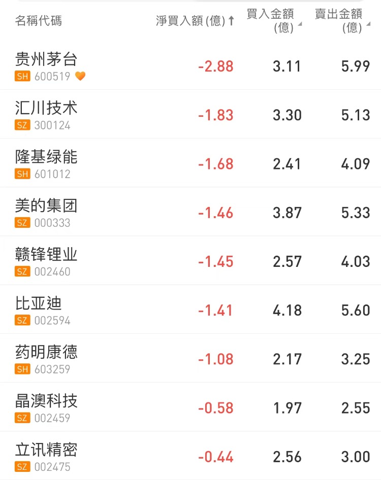 北上资金今日净卖出A股30.32亿元。贵州茅台、汇川技术、隆基绿能分别遭净卖出2.88亿元、1.83亿元、1.68亿元。农业银行净买入额居首,金额为2.73亿元。