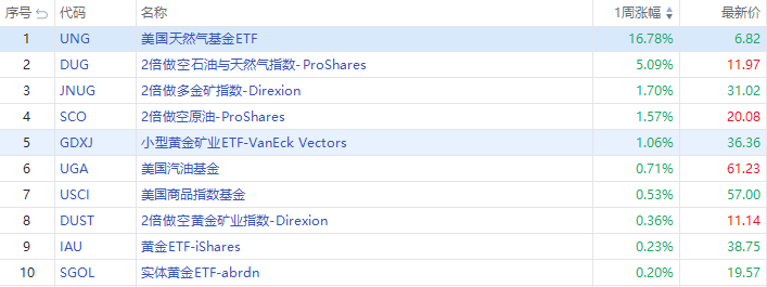 当周做多天然气ETF涨幅强势,美国天然气基金ETF $UNG 周涨超16%,2倍做空石油与天然气指数- Proshares $DUG 周涨5%。消息面上,天气预报显示,美国大部分地区变得更加寒冷,美国南加州部分地区将出现冰冻天气。