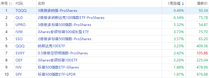 此外,由于美联储降息预期再度升温,标普500指数本周也涨超1%。3倍做多标普500指数-Proshares周涨超5%、2倍做多标普500指数-Proshares周涨超3%。