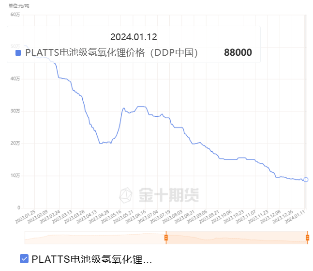 1月12日,Platts将电池级氢氧化锂的价格(DDP中国)评估为每吨88000元,较前一日持平,但较上周下跌了3000元。