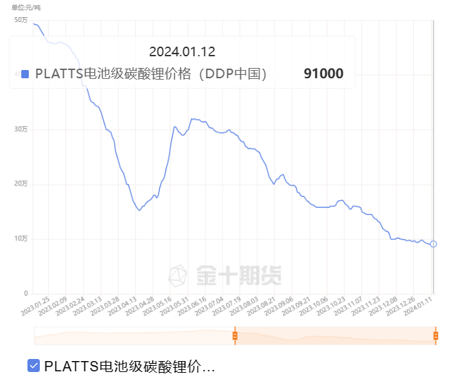 1月12日,Platts将电池级碳酸锂的价格(DDP中国)评估为每吨91000元,较前一周下跌了2000元。