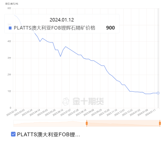上游产品方面,1月12日,普氏评估澳大利亚FOB基准下6%氧化锂含量的锂辉石精矿价格为每吨900美元,较前一日持平,较上周下跌了50美元。