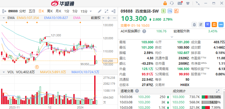 1月16日讯,港股百度集团-SW(09888)早盘反弹,一度升超3%,截至发稿,涨2.79%,报103.3港元,成交额4.15亿港元。