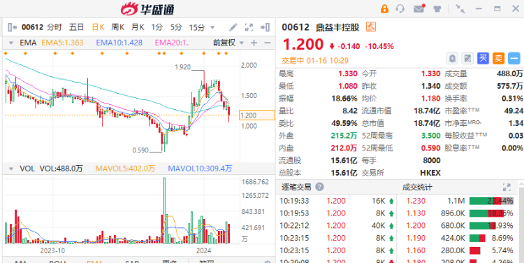 1月16日讯,港股鼎益丰控股(00612)早盘再跌超10%,近五日累跌30%。截至发稿,跌10.45%,报1.20港元,成交额575万港元。