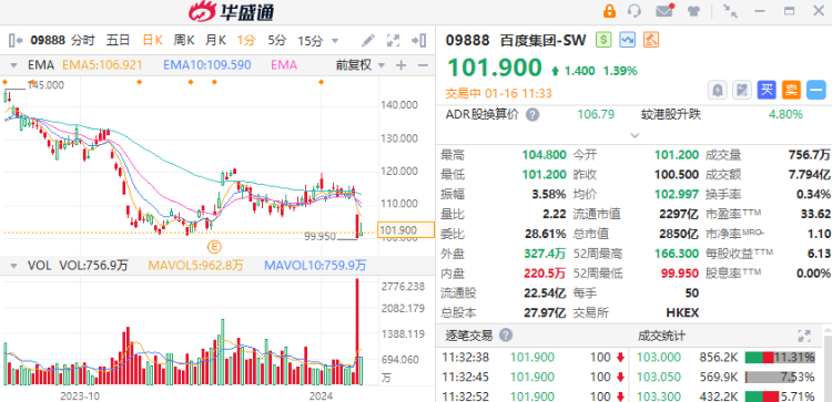 受上述消息刺激,百度集团港股昨日大跌11.53%以致拖累科技指数,今日股价出现小幅回升。截至发稿,涨3.38%,报103.9港元。