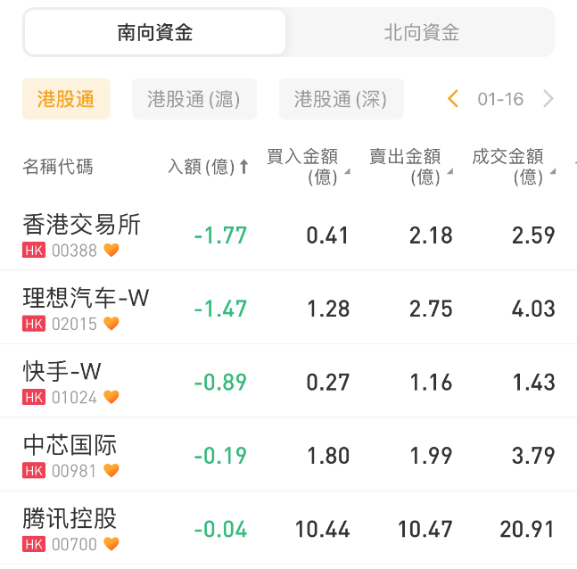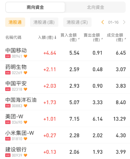 南下资金今日净买入中国移动4.64亿港元,药明生物、中国平安分别获加仓2.11亿港元、2.03亿港元。香港交易所、理想汽车分别遭净卖出1.77亿港元、1.47亿港元。