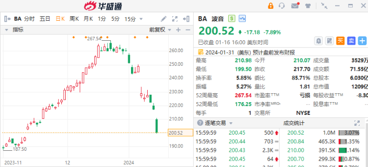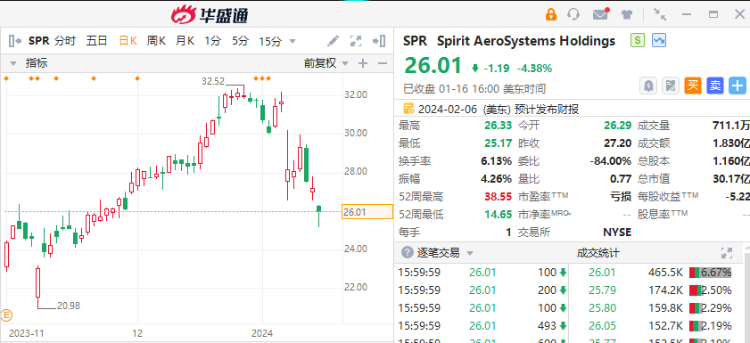 与此同时,波音最大供应商、其飞机舱门的生产商Spirit AeroSystems $SPR 当地时间1月16日早盘曾跌超7%,收跌4.38%。