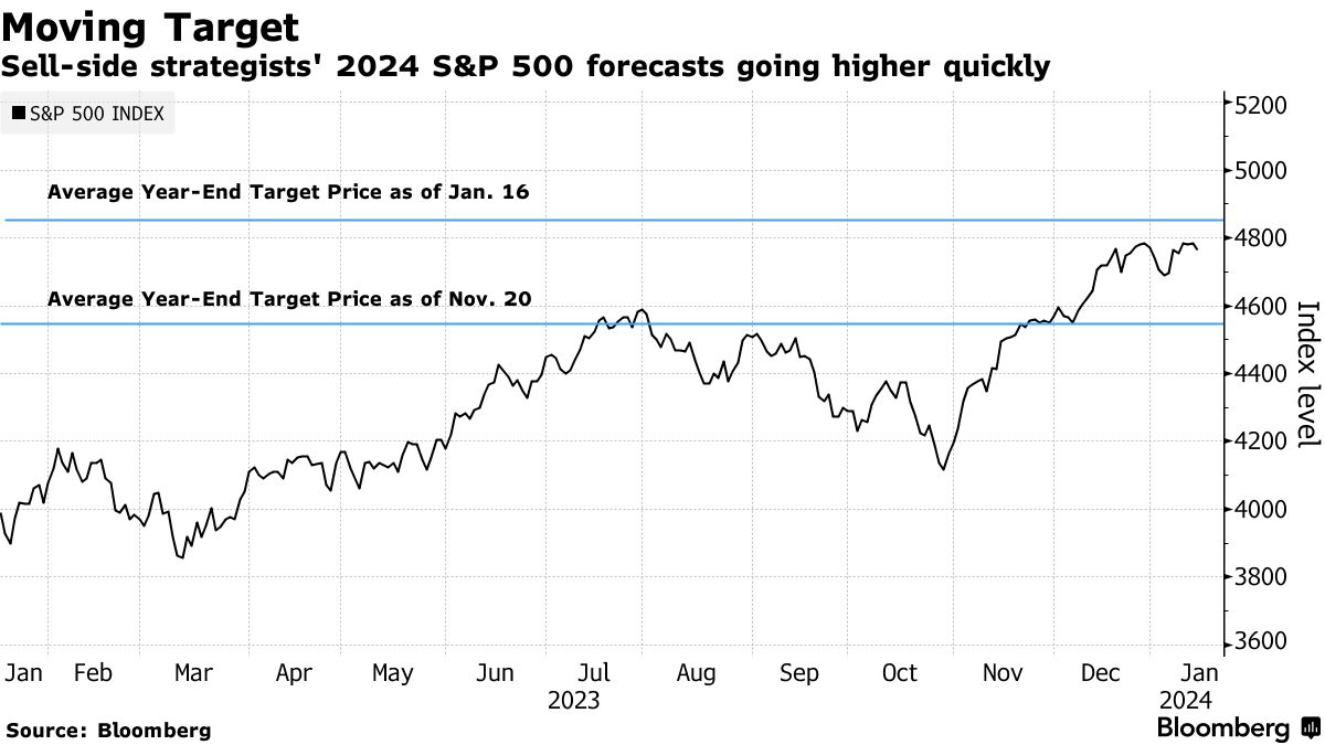 截至1月16日,彭博追踪的卖方策略师的平均目标为4851点,而去年11月底为4546点。