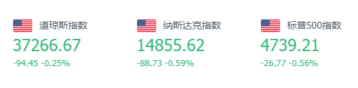美股周三收跌,道指连续第三个交易日下滑;截至收盘,道指跌0.25%,纳指跌0.59%,标普500指数跌0.56%。大型科技股普跌,苹果跌0.52%,微软跌0.20%,特斯拉跌1.98%,谷歌跌0.72%,亚马逊跌0.95%,Meta涨0.25%,英伟达跌0.58%,奈飞跌0.19%。热门中概股集体下跌,纳斯达克中国金龙指数跌2.59%,阿里巴巴跌0.76%,京东跌4.92%,拼多多跌0.71%,蔚来汽车跌3.82%,小鹏汽车跌4.90%