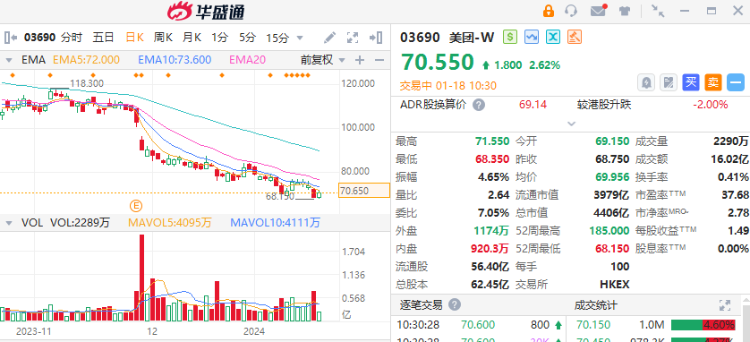 1月18日讯,美团(03690)昨日收跌6.97%,报68.75港元,跌破发行价69港元。今日触底反弹,回升2.84%,报70.65港元,成交额10.71亿港元。