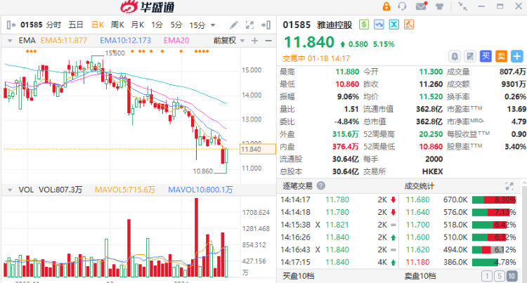 1月18日讯,港股雅迪控股(01585)涨超5%,截止发稿涨5.15%,报11.84港元,成交额9289万港元。