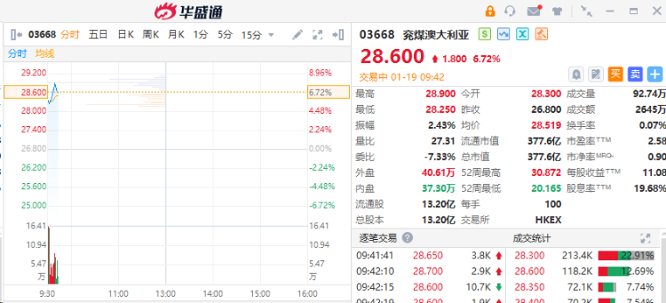 兖煤澳大利亚 $03668.HK 盘初强势走高,截至发稿,涨6.72%,报28.6港元,成交额2645万港元。