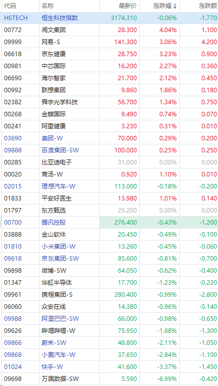 阅文集团涨超4%,网易、京东健康涨超3%,中芯国际涨超2%,联想集团、舜宇光学科技涨超1%,美团、百度跟涨。