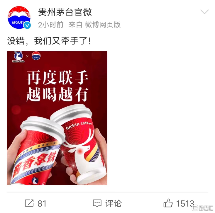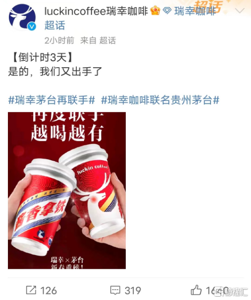 今日,瑞幸咖啡在微博发文:“【倒计时3天】是的,我们有出手了”,并配图“再度联手,越喝越有”的宣传海报。随后,贵州茅台官微也发文表示:“没错,我们又牵手了”。