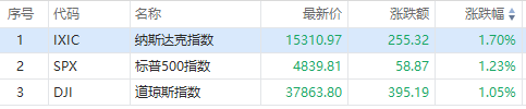 道指涨395.19点,涨幅为1.05%,报37863.80点;纳指涨255.32点,涨幅为1.70%,报15310.97点;标普500指数涨58.87点,涨幅为1.23%,报4839.81点。