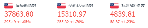 上周五,美股三大股指全线收涨,道指涨1.05%,纳指涨1.7%,标普500指数涨1.23%。其中,道指、标普500指数均创收盘历史新高。