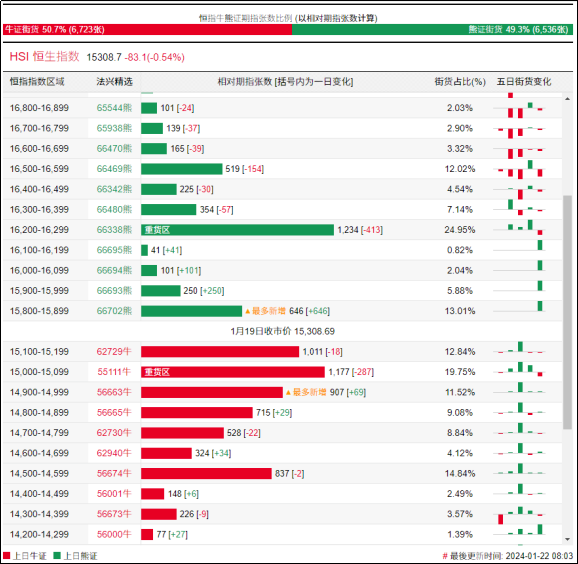 街货分布方面,至上周五,恒指牛证街货重货区间主要在收回价14700点至15200点之间,累计相当约4338张期指合约;恒指熊证街货重货区主要在收回价15800点至16200点,累计相当约2272张期指合约。