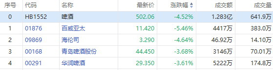 1月22日,啤酒股继续下挫,截至发稿,百威亚太跌超5%,海伦司跌超4%,青岛啤酒股份、华润啤酒跌超3%。