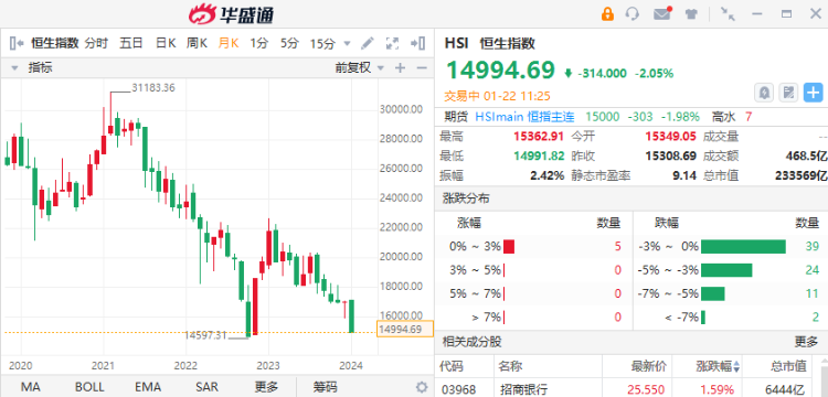 华盛资讯1月22日讯,港股高开低走,加速下挫,截至发稿,恒指跌超2%,恒生科指跌超2.7%。值得关注的是,恒指月内累跌逾12%,恒生科指累跌超19%。