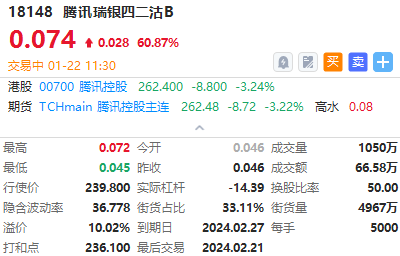 因腾讯控股日内大跌3%,这个认沽证大幅上涨超60%。买入此认沽证来看跌腾讯,则可以在正股下跌时,获得相应的收益。
