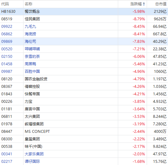 蓝筹美团(03690.HK)、周黑鸭(01458.HK) 、颐海(01579.HK) 、呷哺呷哺(00520.HK) 及蓝筹海底捞(06862.HK) 续挫5%-7%,股价均创逾一年、甚至纪录低,后者跌幅最大,报12.16港元。奈雪的茶(02150.HK) 续挫4.7%曾低见2.78港元创上市新低。百胜中国(09987.HK) 扭两连升,最低见262.6港元再创上市新低。