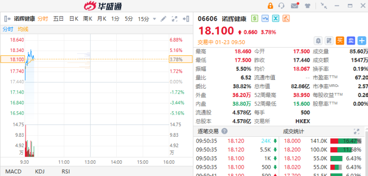 1月23日,诺辉健康(06606)早盘一度涨超5%,截至发稿,涨3.78%,报18.1港元,成交额1547万港元。