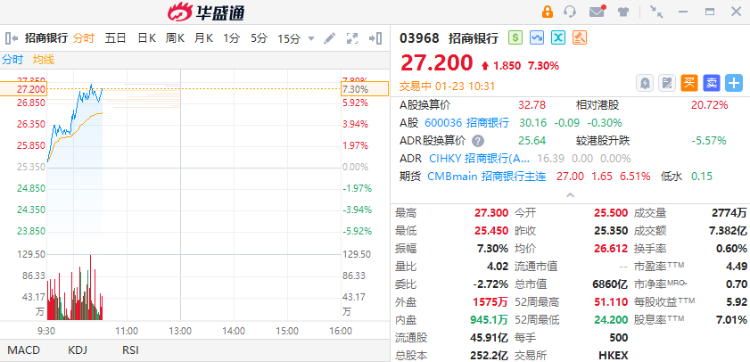 1月23日,招商银行(03968)股价走强,截至发稿,涨7.3%,报27.2港元,成交额7.382亿港元。