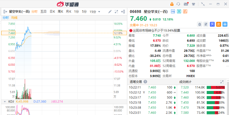 星空华文(06698)一度反弹涨超14%,截至发稿,涨12%,报7.46港元,成交额1668万港元。