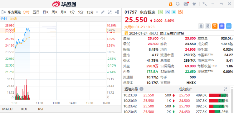 华盛资讯1月23日消息,东方甄选(01797)早盘走高,截至发稿,涨8.49%,报25.55港元,成交额1.315亿港元。