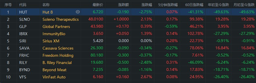 上周,S3 Partners报告了10只股票借贷利率最高的个股,这些股票的未偿空头净额(Short Interest)超过2500万美元。名单如下:VinFast Auto(VFS.US)、Beyond Meat(BYND.US)、B. Riley Financial(RILY.US)、Freedom Holding(FRHC.US)、Cassava Sciences(SAVA.US)、Sirius XM(SIRI.US)、ImmunityBio(IBRX.US)、Global Partners(GLP.US)、Soleno Therapeutics(SLNO.US)、Hut 8(HUT.US)。在这些被严重做空的股票中,近一半个股在周一上涨。