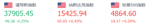 周二,美股三大股指收盘涨跌不一,道指跌0.25%报37905.45点,纳指涨0.43%报15425.94点,标普500指数涨0.29%报4864.6点,续创历史新高。科技股中,Meta涨0.9%,特斯拉涨0.16%。