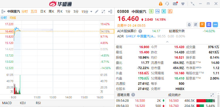 1月24日,中国重汽早盘走强,截至发稿,涨14.15%,报16.46港元,成交额6213万港元。