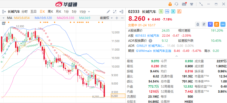 长城汽车绩后跌超7%,现报8.26港元,最新总市值702亿港元;2023年归母净利润70.08亿元,同比下降15.22%。