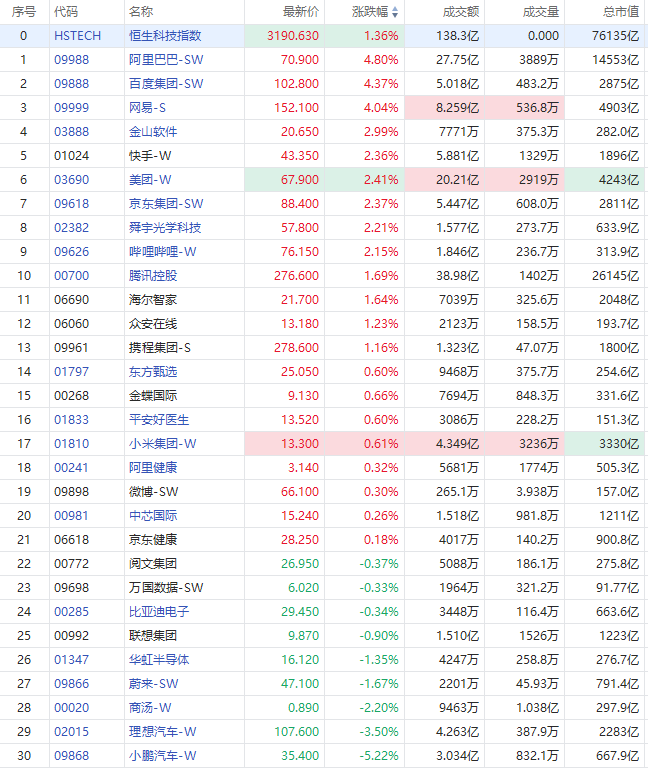 科网股多数走高,阿里巴巴-SW、百度集团-SW、网易-S涨超4%,快手-W、美团-W、京东集团-SW、哔哩哔哩-W涨超2%,腾讯控股涨超1%。