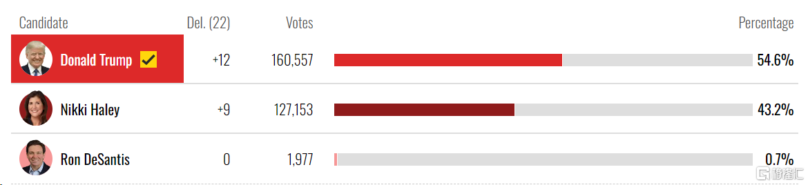据美媒报道,此次竞选特朗普以53%:46% 的选票,领先其在共和党内的最后一名竞争对手——前联合国大使黑莉。