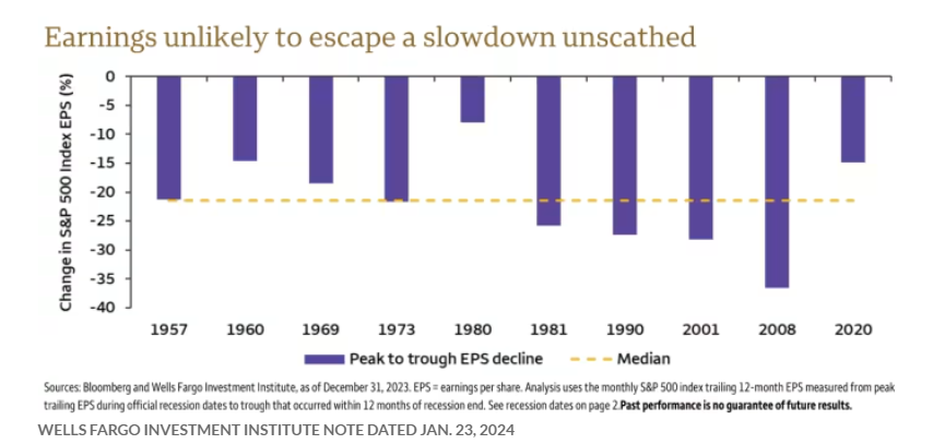 富国银行研究了标普500指数在过去12个月的每股收益(EPS)下降情况,警告投资者公司收益“不太可能毫发无损地逃脱经济放缓的影响”。从峰值到谷底的中位数跌幅达到21.4%。