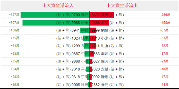 淡仓(认沽证及熊证)方面,周三腾讯相关淡仓录得约727万港元资金净流入,阿里、中移相关淡仓单日录得约707万、100万港元资金净流入;相反,美团相关淡仓单日录得约256万港元资金净流出,港交、网易相关淡仓单日分别录得约198万、67万港元资金净流出。