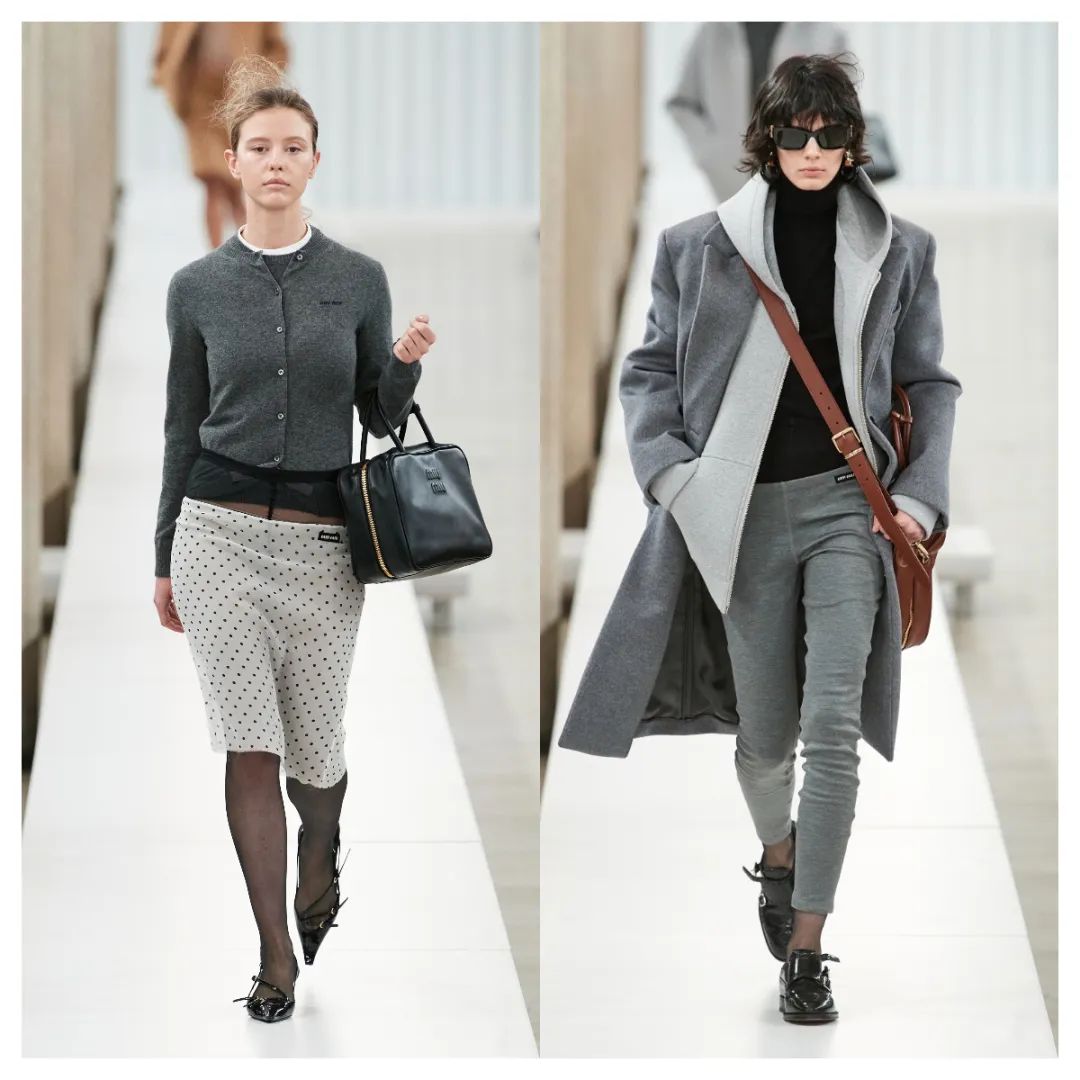 Miu Miu2023秋冬秀场里用到了大量的灰色,浅灰色卫衣、深灰色毛衣、低腰灰色紧身裤、还有几乎人手一件的灰色系大衣,成功将灰色送入了富家女的衣橱。
