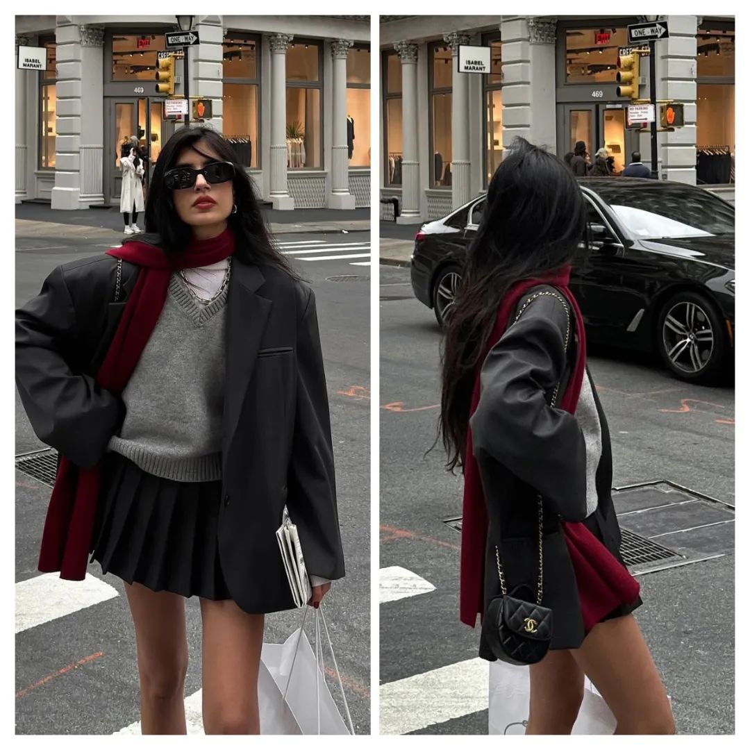例如像Instagram的时尚博主@narrinanatasha这样戴一条红色围巾,一下就让这套常规的灰色学院风西装变得活泼俏皮起来。过年想要穿出“喜庆灰”的姐妹可以借鉴一下这个思路。