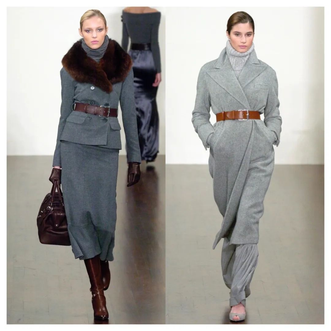 这样的细节亮点可以是不同的材质。 比如老钱风的代表Ralph Lauren曾经做过一季经典的高级灰。在其中用毛茸茸的皮草,还有硬挺具有光泽的皮靴、皮包、皮带制造小冲突来调和全身都是灰色的单调。