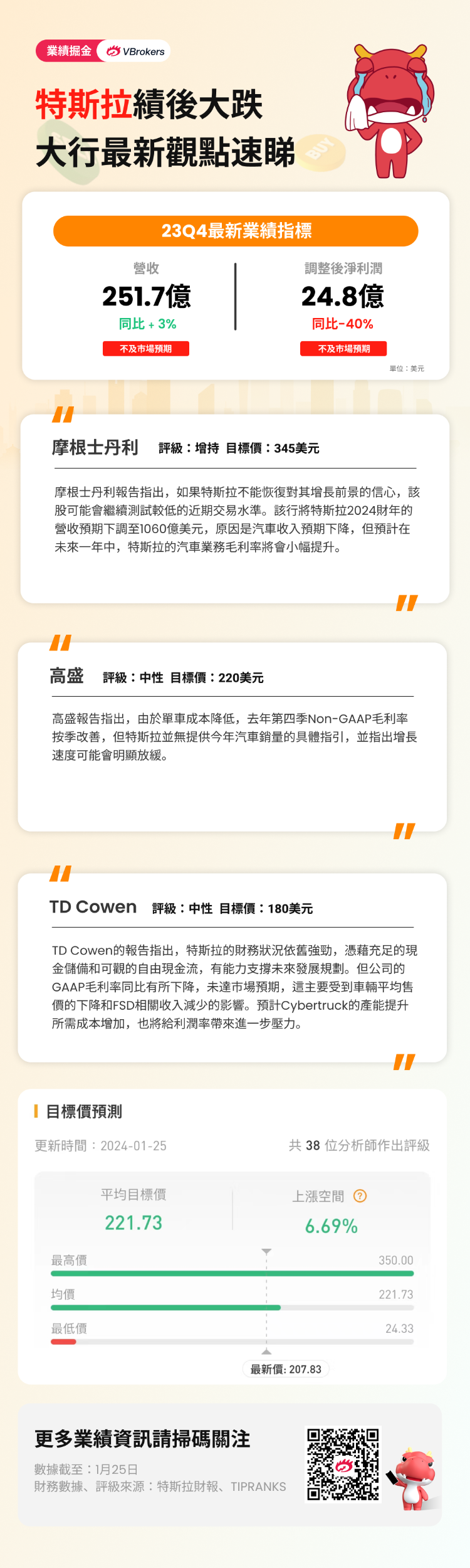1月24日盘后,特斯拉公布第四财季营收251.7亿美元,调整后净利润仅有24.8亿美元,同比大降40%,这引发了市场对特斯拉抛售行为。今日盘前,特斯拉一度大跌超8%。