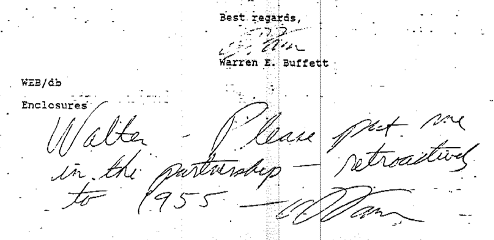 最后,附上一个有意思的签名,是1994年巴菲特赞美施洛斯的一封信中,在信的底部亲笔写道:沃尔特,请让我加入合伙企业——如果回到1955 年。