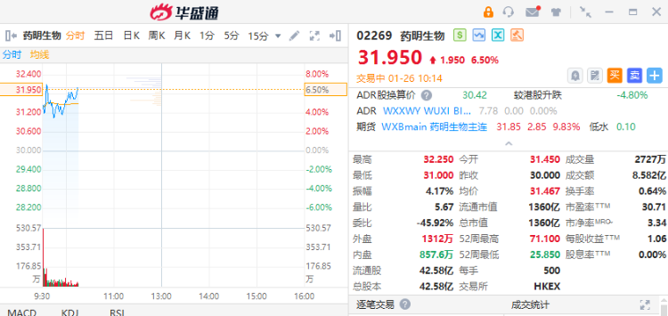 1月26日,药明生物(02269)早盘高开,截至发稿,涨6.5%,报31.95港元,成交额8.582亿港元。