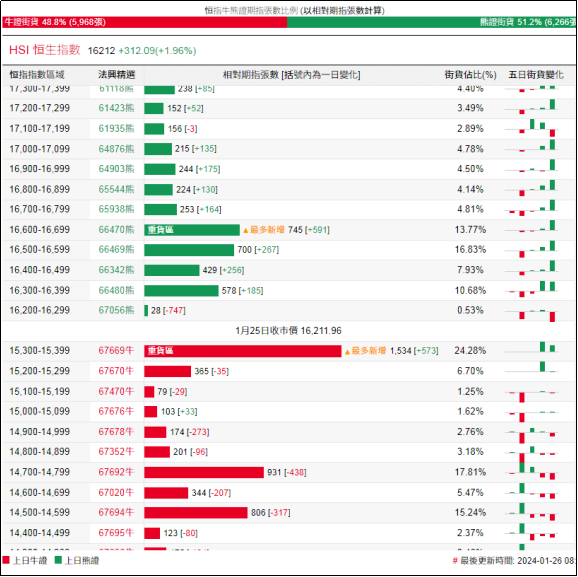 街货分布方面,至周四,恒指牛证街货重货区间主要在收回价14700点至15400点之间,累计相当约3,387张期指合约;恒指熊证街货重货区主要在收回价16300点至16900点,累计相当约2.929张期指合约。