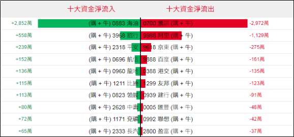 好仓(认购证及牛证)方面,周四海油相关好仓单日录得约2,852万港元资金净流入,招行、平安相关好仓单日分别录得约558万、239万港元资金净流入;相反,腾讯相关好仓单日录得约2,972万港元资金净流出,阿里、京东相关好仓单日分别录得约1,129万、275万港元资金净流出。