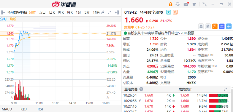 1月26日,马可数字科技(01942)早盘大涨,截至发稿,涨21.17%,报1.66港元,成交额2.241亿港元。