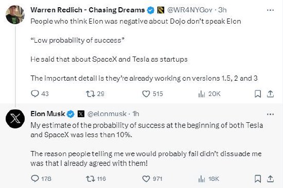 一位X用户周四发帖称:“那些认为埃隆对Dojo持消极态度的人不会说埃隆‘成功概率低’。