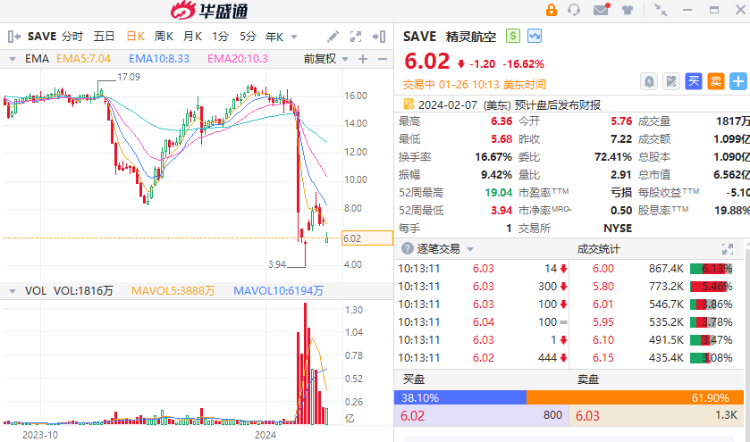 周五,精灵航空(SAVE.US)股价暴跌,截至发稿,该股跌近16%,报6.08美元。公司与捷蓝航空(JBLU.US)合并交易可能在1月28日或之后终止,将继续评估合并协议下的选择。