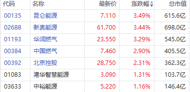 1月29日,燃气股早盘再度拉升,截至发稿,昆仑能源、新奥能源、华润燃气涨超3%,中国燃气涨超2%,中裕能源涨超1%。